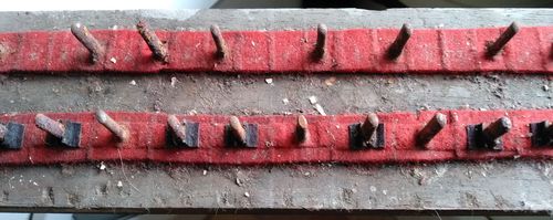 All three keyboards were very dirty: they were covered with a century's collection of dust, finger-grease and plaster debris from the decaying ceiling. The keys of the upper two keyboards - the great and swell manuals - were rather stiff with friction at both front rail and balance pins due to light corrosion of the pins. The choir keys were completely jammed. On investigation, evidence of a liquid spill was found in the lower keyboard - which had rusted the front rail pins. The pins had fused with the cloth bushings on the keys.