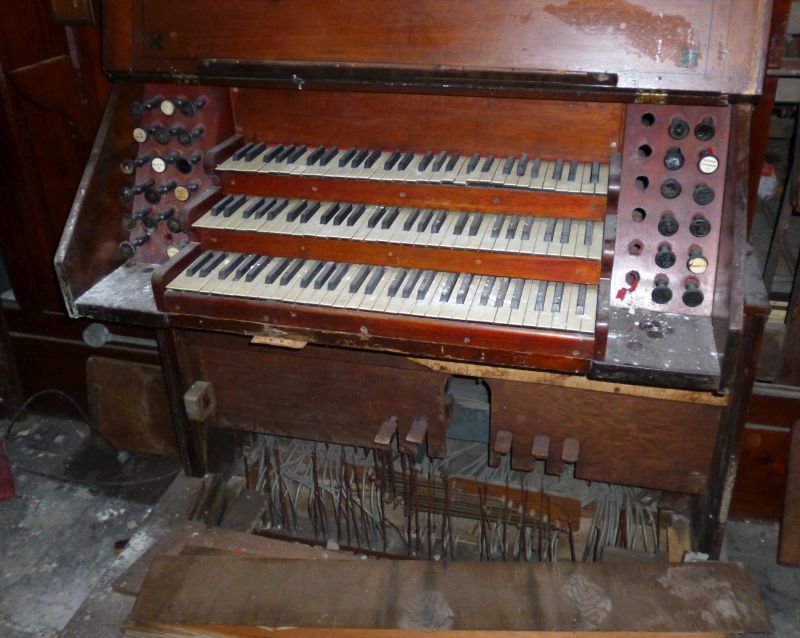The organ was well beyond repair. All that remains is the decorative pipework, some of the larger wooden pipes with their chests and much of the original tracker action.