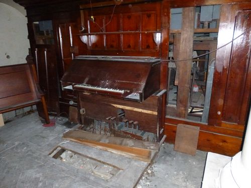 The organ was well beyond repair. All that remains is the decorative pipework, some of the larger wooden pipes with their chests and much of the original tracker action.