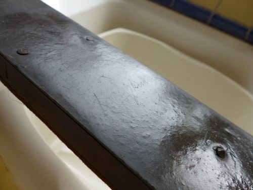 All three keyboards were very dirty: they were covered with a century's collection of dust, finger-grease and plaster debris from the decaying ceiling. The keys of the upper two keyboards - the great and swell manuals - were rather stiff with friction at both front rail and balance pins due to light corrosion of the pins. The choir keys were completely jammed. On investigation, evidence of a liquid spill was found in the lower keyboard - which had rusted the front rail pins. The pins had fused with the cloth bushings on the keys.