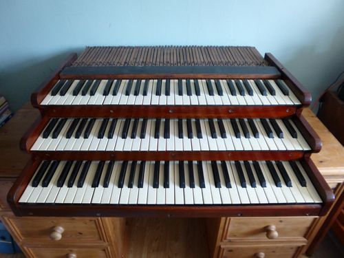 The keys were removed and brushed free from dust; the coverings (the white plastics and the black ebonies) were then cleaned with a soft cloth and a little washing-up detergent. The balance pins and front pins were cleaned and polished. The choir keys were rebushed. The frame was dusted and wiped with a damp cloth; The original polished finish was revived with a wipe of french polish. This process was repeated for all three manuals.